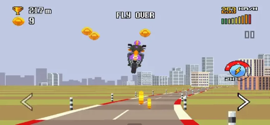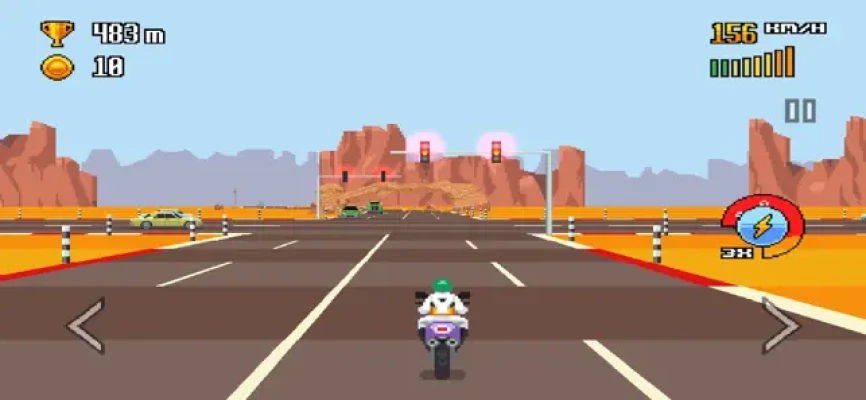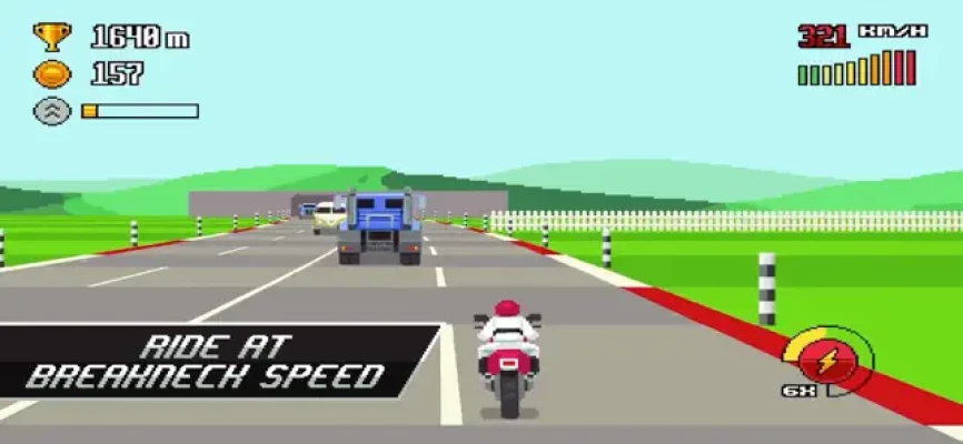 • Experience high octane old school action on your phone or tablet • Complete daring challenges and compete with your friends or the whole world for the highest scores • Explore six unique environments ranging from a hot desert freeway to a futuristic moon base • Customize your playstyle by choosing from a diverse garage of 10+ bikes and by upgrading various powerups • Embrace the nostalgia rush caused by stylish pixel art visuals and chiptune soundtrack