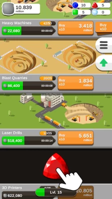 Besides rocks you can also collect gems. Gems are beautifully colored shiny rocks which can be used to boost your profits in various ways.