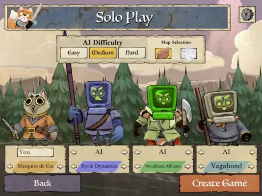The nefarious Marquise de Cat has seized the great woodland, intent on harvesting its riches. Under her rule, the many creatures of the forest have banded together. This Alliance will seek to strengthen its resources and subvert the rule of Cats. In this effort, the Alliance may enlist the help of the wandering Vagabonds who are able to move through the more dangerous woodland paths. Though some may sympathize with the Alliance’s hopes and dreams, these wanderers are old enough to remember the great birds of prey who once controlled the woods.
