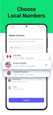 Phone numbers of the following countries are available in the app: the USA, Canada, Israel, Puerto Rico, the United Kingdom, Estonia, Belgium, and Poland.