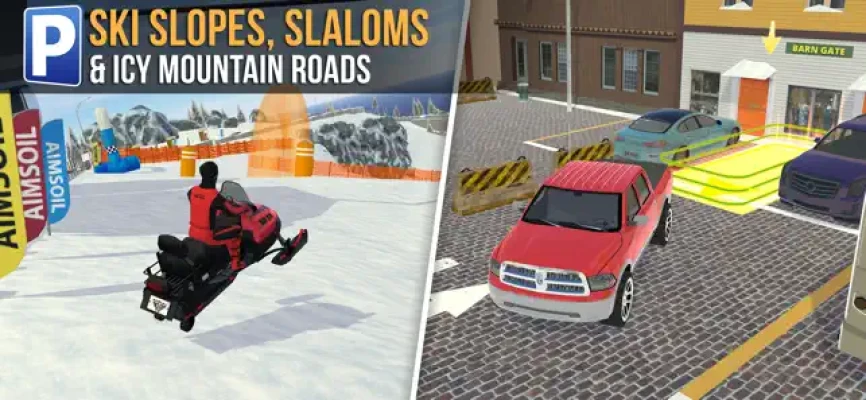Welcome to the Ski Resort Village. Start your Vacation Today! Drive & Park a HUGE roster of ‘Winter Vehicles’ around the cute snow covered ski village. Park cars, trucks, snow plows, gritters, cars & caravans, busses and even a super-quick snowmobile! Discover mountain roads, beautiful chalets, hotels, ice skate rinks, ski slopes and slaloms!