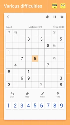 Smart Notes: When the difficulty level is Hard or Expert, you can use Smart Notes feature to take notes automatically. Smart Notes will reduce the difficulty of the Hard and Expert level Sudoku puzzle games when you need.