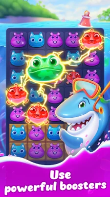 Dive into the ocean of exciting match 3 levels, but remember that not all underwater inhabitants like noisy and cheerful three in a row companies, so get ready to meet a real shark on your way! This shark is challenging our friends - join their team and don't let the shark ruin the summer holidays in a wonderful match 3 in a row.