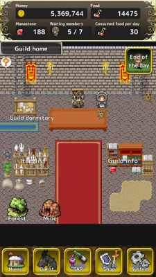 ·Clear quests and gain rewards! Defeat monsters to gain more rewards! · Gather food from the forest to supply your guild members! Save money by foraging! · Recruit new guild members! Find chance encounters at the bar. · Expand the guild! More guild members means more quest rewards! · Build convenient facilities for the guild. Find the right expansion for your guild. · Buy items from the shop! Many convenient items and services for sale. · Unlock more facilities by completing quests!