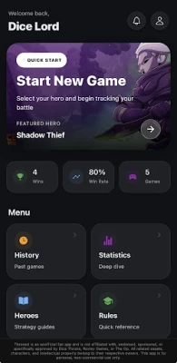 Track your wins, losses, and win rate automatically. View character-specific performance to see which heroes you dominate with. Browse your recent game history with detailed match information. Export your data for backup or manually log games played offline.