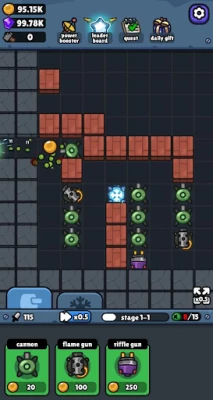 🧱 Unique Maze Mechanics Unlike traditional TD games, you can place walls to shape the enemy’s path. Create complex mazes to maximize turret damage and control the battlefield.