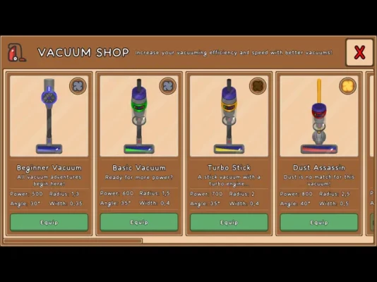 Upgrade your vacuums, boost your idle gains, and enhance your robot vacuums as you earn achievements and explore many exciting locations in the Vacuum Warrior universe!