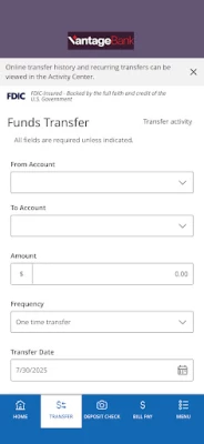 • Access your deposit and loan accounts • Review activity and balances in your accounts • Deposit checks • Transfer funds between accounts • Setup alerts for important account information • Exchange secure messages and files with Vantage