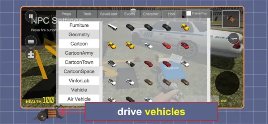 In the Vmod sandbox, you can build structures with various items and tools, drive cars, helicopters and have fun with friends.