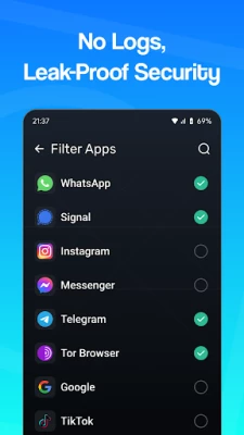 Ability to select specific apps that use VPN, requiring Android 5.0 or higher.