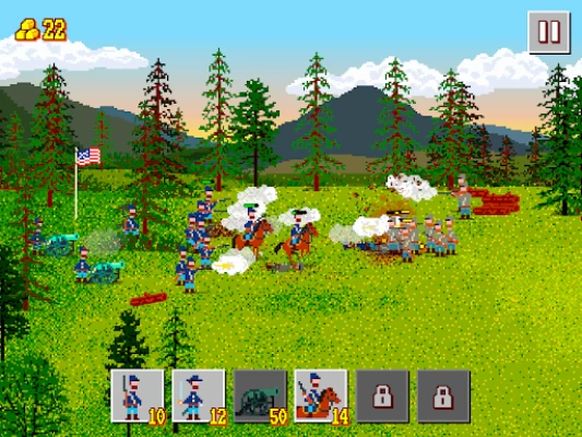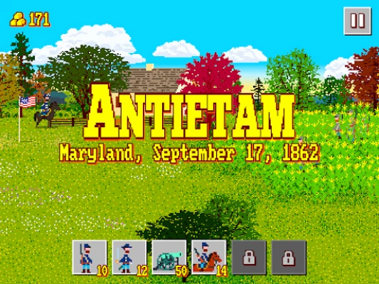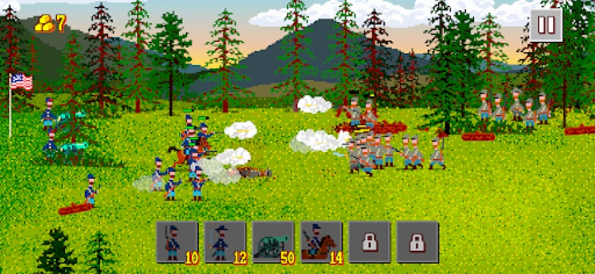 Retro Visual Style and Music: Experience the American Civil War through vibrant pixel graphics, filled with color and detail, accompanied by classic Civil War-era tunes including "When Johnny Comes Marching Home" and "Battle Hymn of the Republic."