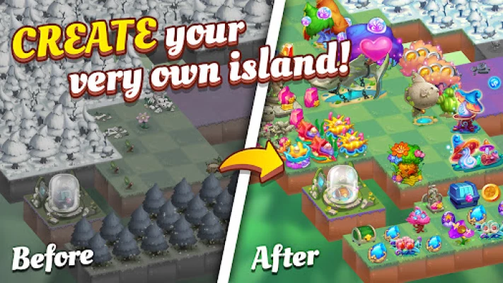 For centuries, the magical Sky Meadow flourished, until the selfishness of its inhabitants created a corruption of the land. Now, all creatures have to come together to heal the land and undo the curse. Matching and merging 3 or more items uncovers the evolution of each, merging eggs helps with collecting dragons and other creatures, and releasing your merging magic heals the corrupted dragon lands and turns them into a magic paradise!