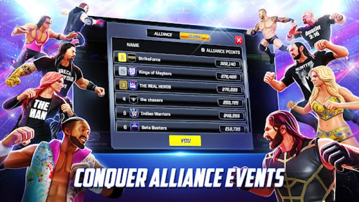 Build your roster of mighty WWE Superstars and join forces with other champions in TAG-TEAM match-ups. Play action-packed EVENTS in sync with real world WWE Live shows like Monday Night RAW, SmackDown Live, Clash of Champions PPV, and monthly Title events.