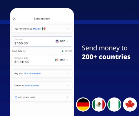 ● Transfer money in as fast as minutes to 200+ countries around the world.