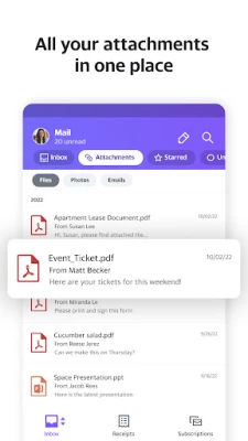 See all your receipts organized in one place so you can easily find the one you're looking for. Digging through receipts from months ago can be a hassle, Yahoo mail app makes this process a breeze.