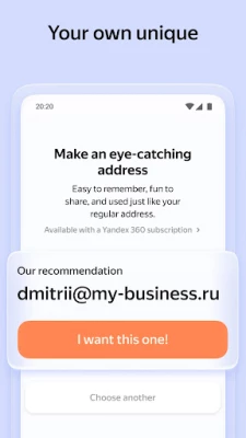 - An exclusive address. Connect Yandex 360 Premium to choose a unique address with your name or what you do. An exclusive address lets people know the line of work you're in. For example: alex@business-design.ru. Your email will stand out and get extra attention.