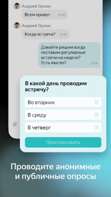 Yandex Messenger is a secure corporate messenger with a familiar interface. We've combined important messenger functions and added the features necessary for working in any business, such as inviting teams or departments to a group chat.