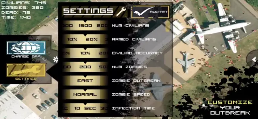 This free version of the app contains limited features, with in-app purchases for upgrades to unlock the full functionality. Initially you have access to two maps (one online, one offline), limited outbreak settings, and limited numbers of bombs, soldiers and helicopters.